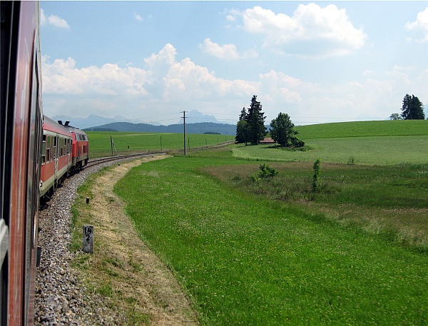 Ab Biessenhofen, wo die Strecke von der Allgäubahn abzweigt, wird es eine wunderschöne Fahrt nach Füssen. Es ist sonnig und warm, man kann am offenen Fenster stehen und der Zug dieselt gemächlich durchs Allgäu. Es gibt viele Pfeiftafeln, dazu das Gebimmel von Kuhglocken, Landluft, Bergpanorama - bayerische Landidylle pur.