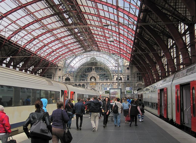 Der Bahnhof wird auch Spoorwegkathedraal (Eisenbahnkathedrale) genannt - ein passender Titel für den stattlichen Bau. Der Bahnhof präsentiert sich von außen mit einem prächtigen Gebäude, innen fühle ich mich mit dem Blick nach unten über die Rolltreppen und die Gleise im Tiefgeschoss etwas an den Berliner Hauptbahnhof erinnert, wobei es hier in Antwerpen sogar drei Ebenen gibt.