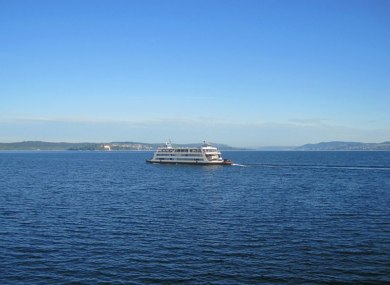 Das Fährschiff Friedrichshafen bringt uns nun hinüber ins schweizerische Romanshorn. 1869 wurde von der Schweizerischen Nordostbahn (NOB) ein Trajektverkehr zwischen Romanshorn und Friedrichshafen eingerichtet. 1974 endete der Fährverkehr mit Eisenbahnwagen, seither werden nur noch Autos und LKW befördert sowie Fußgänger und Radfahrer. Zwischenzeitlich wurde der Fährverkehr von den SBB und den DB betrieben, heute sind die Betreiber die Bodensee-Schiffsbetriebe und die Schweizerische Bodensee Schifffahrt in Romanshorn. Als Relikt aus der Bahn-Ära können noch heute durchgehende Bahnfahrkarten via Fähre gelöst werden. Das Fährschiff Friedrichshafen war ursprünglich eine Eisenbahnfähre der SBB und verkehrte unter dem Namen Rorschach. Sie wurde erst später in eine Autofähre umgebaut und 1983 umbenannt.