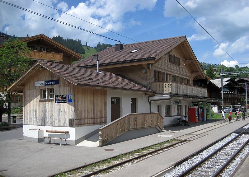 In Zweisimmen endet die normalspurige Bahnstrecke der BLS, hier heißt es Umsteigen auf die meterspurigen Strecken der Montreux-Berner Oberland-Bahn (MOB) nach Lenk sowie Richtung Montreux. Die Strecke nach Lenk steht später auf dem Plan, zunächst steigen wir in den Regio-Zug nach Gstaad. Auf dieser Strecke verkehrt auch der GoldenPass Panoramic (siehe Reisebericht von 2012).