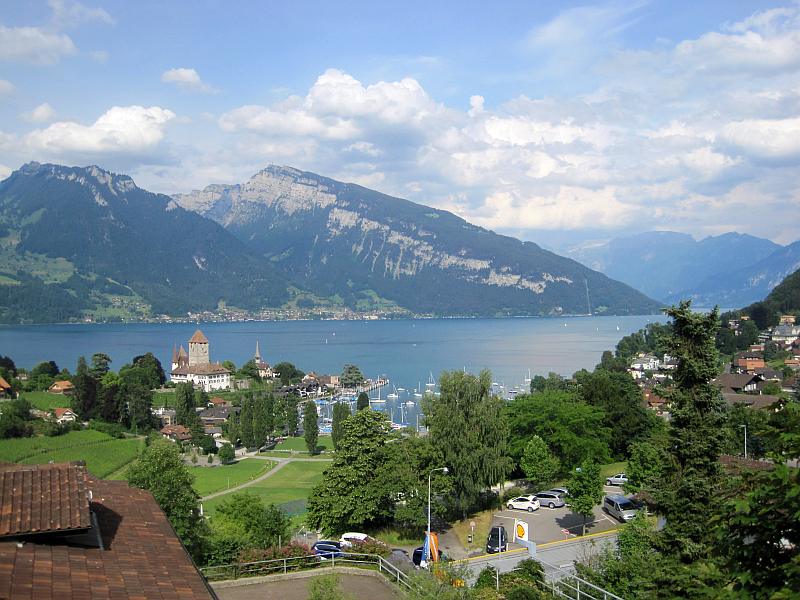 Blick vom Bahnhofsplatz Spiez über den Thuner See