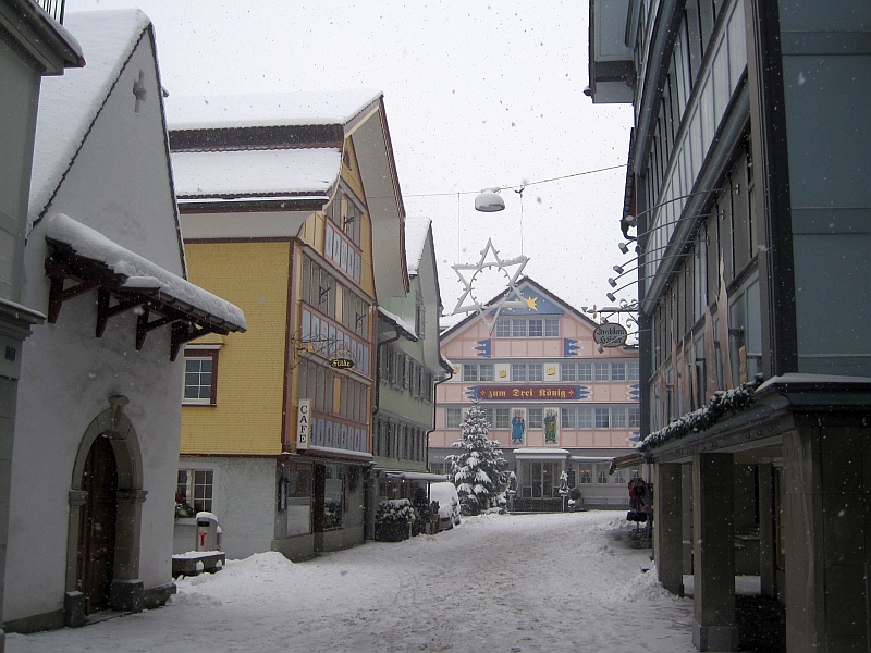 Nach einer Fahrzeit von einer Dreiviertelstunde ist der Endbahnhof Appenzell erreicht. Auch hier legen wir einen Zwischenstopp ein und spazieren durch den Hauptort des Kantons Appenzell Innerrhoden mit seinen prächtigen Holzhäusern.
