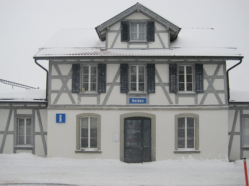 Der Bahnhof von Heiden liegt auf einer Höhe von knapp 800 Meter über dem Meeresspiegel, mit der normalspurigen Zahnradbahn fahren wir etwa 400 Höhenmeter hinab nach Rorschach. Die ehemalige Rorschach-Heiden-Bergbahn (RHB) gehört heute zu den Appenzeller Bahnen. Auf der Strecke verkehrt ein Triebwagen von Stadler, im Gegensatz zu den herkömmlichen Gelenktriebwagen dieses Herstellers ist der Antrieb nicht in der Zugmitte untergebracht, sondern am talseitigen Ende des Triebwagens.