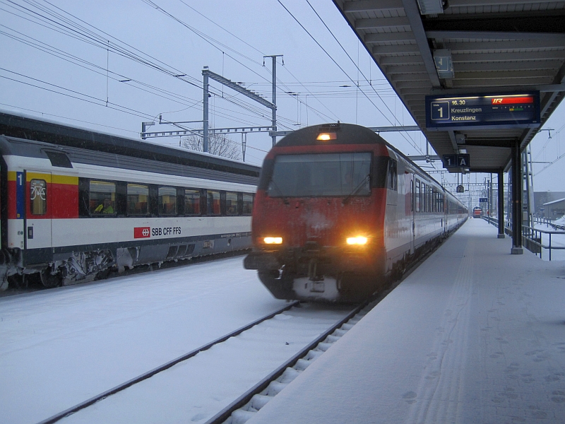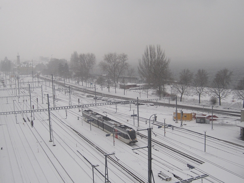 Die Gleisanlagen des Bahnhofs von Konstanz liegen unter einer dünnen Schneedecke, richtig viel Schnee liegt hier am Morgen noch nicht. Die S 14 aus Kreuzlingen wendet in Konstanz und nimmt uns auf ihrem Rückweg mit über die deutsch-schweizerische Grenze. Nach dem Umstieg in Kreuzlingen geht es mit der S 8 nach Sankt Gallen. Dunkle Schneewolken hängen über dem Bodensee, anfangs fallen nur ein paar Flocken, dann nimmt der Schneefall zu.