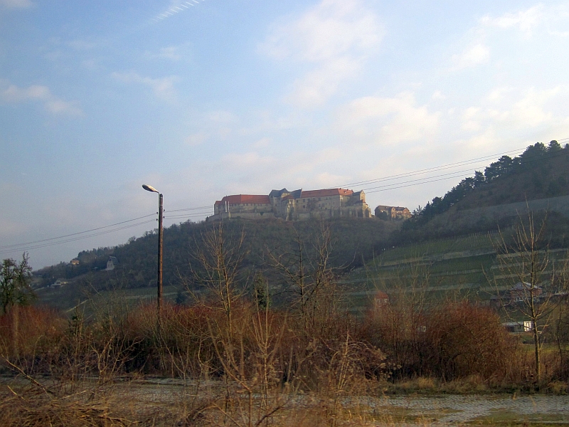 Blick vom Zug auf die mittelalterliche Höhenburg Schloss Neuenburg