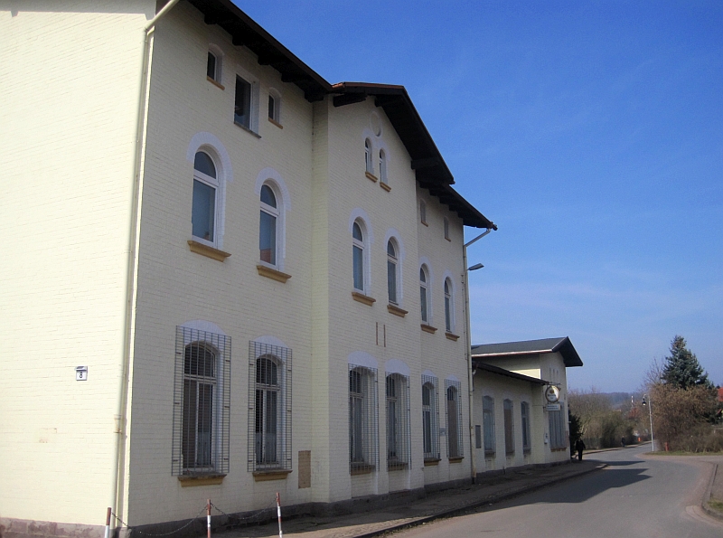 Der Ort Niedersachswerfen liegt zwischen der Harzquerbahn und der normalspurigen Südharzstrecke. Am Haltepunkt Niedersachswerfen Ost verlassen wir den Schmalspurtriebwagen und laufen durch den Ort zum DB-Bahnhof.