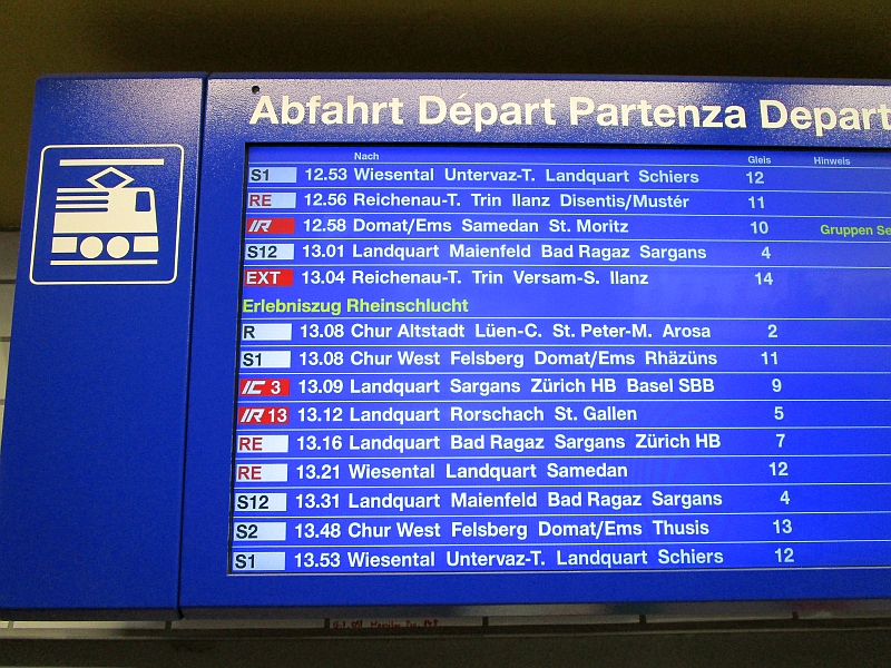 Abfahrtstafel Bahnhof Chur mit dem 'Erlebniszug Rheinschlucht'