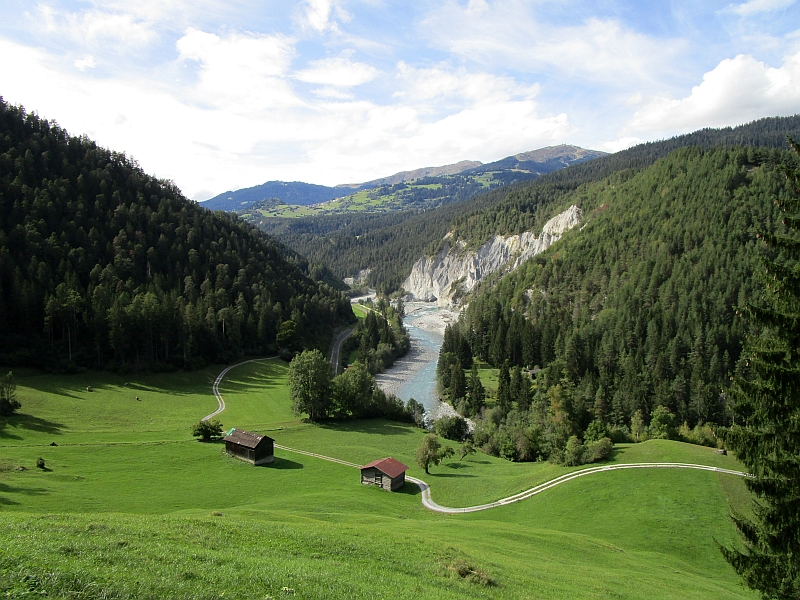 Die Ruinaulta bietet sich für Rafting und Kajaktouren an, wir entscheiden uns jedoch für eine Wandertour und laufen eine Station durch das Rheintal zurück. Der Wanderweg führt erst unten am Rhein, dann für einen Abschnitt über die Höhe, dabei ist die Bahnstrecke meist in Sichtweite. Von Versam-Safien fahren wir schließlich mit einem Regelzug zurück nach Chur.