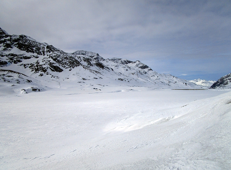 Unser Ziel ist der Bahnhof Ospizio Bernina, dies ist die höchstgelegene Bahnstation im Netz der Rhätischen Bahn. Der Bahnhof liegt am Ufer des Lago Bianco, der Stausee ist jedoch unter einer dicken Schneedecke verborgen. Mit 2.253 Metern über dem Meer ist die Berninabahn die höchste Eisenbahn-Alpenquerung, gemeinsam mit der Albulabahn gehört sie zum UNESCO-Weltkulturerbe.